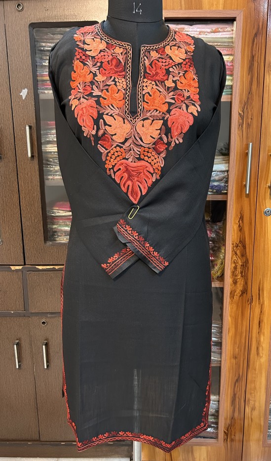 Redefine your style with our sophisticated Kashmiri Aari Embroidered Black Cotton Kurta. This captivating kurta is a masterpiece of traditional Kashmiri Aari work, boasting vibrant and bold floral and leaf motifs that stand out beautifully against the classic black cotton fabric. Designed for comfort and elegance, it's made from premium, breathable cotton, ensuring a delightful feel all day long. The intricate embroidery adorning the neckline, cuffs, and hem adds a touch of artisanal charm, making it a perfect choice for those who appreciate unique ethnic fashion. Elevate your everyday look or dress it up for an evening out.