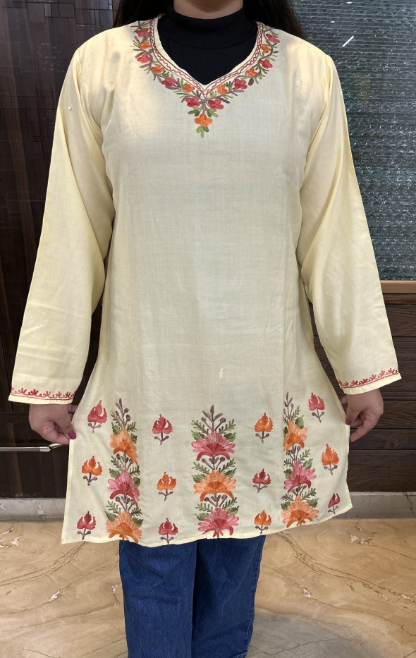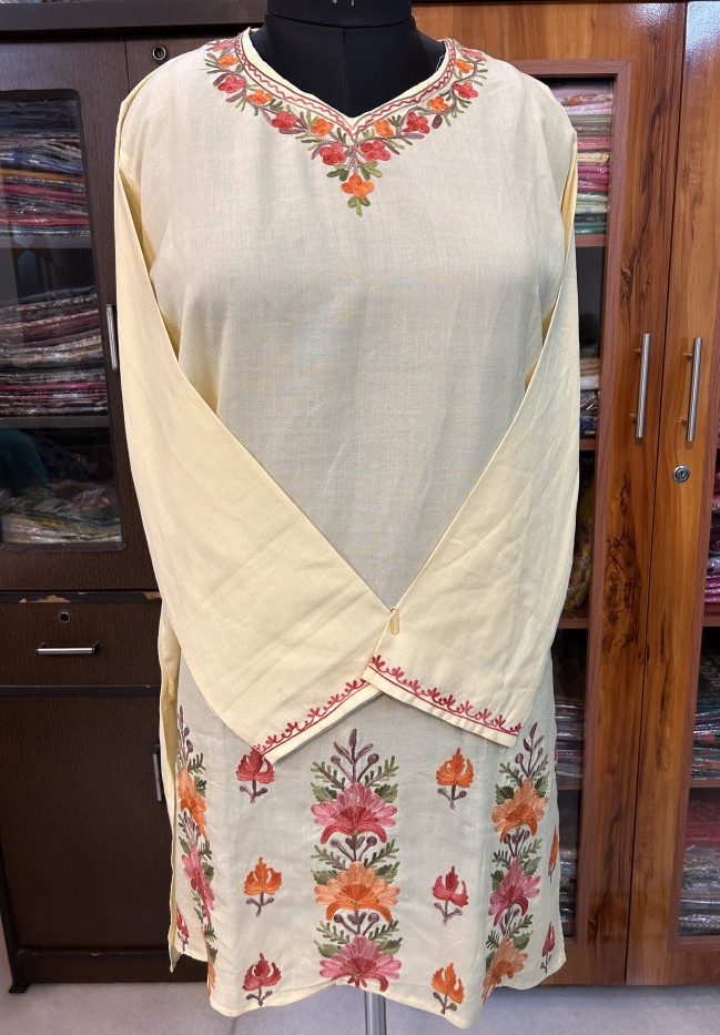 Discover the subtle elegance of our Artisan Crafted Kashmiri Aari Cotton Kurti. This beautiful piece, made from 100% pure, breathable cotton, offers supreme comfort with a touch of refined style. The pristine beige base serves as a perfect canvas for the stunning Kashmiri Aari embroidery, featuring a vibrant array of floral and vine motifs in shades of red, orange, and pink. The intricate handwork graces the neckline, extends down the front, and adds delicate touches to the cuffs and hem, reflecting the rich artistic heritage of Kashmir. Ideal for both daily wear and special occasions, this versatile kurti pairs wonderfully with a variety of bottoms, from white palazzo pants to jeans, creating a look that is both graceful and unique. Elevate your wardrobe with this timeless piece of Indian craftsmanship.