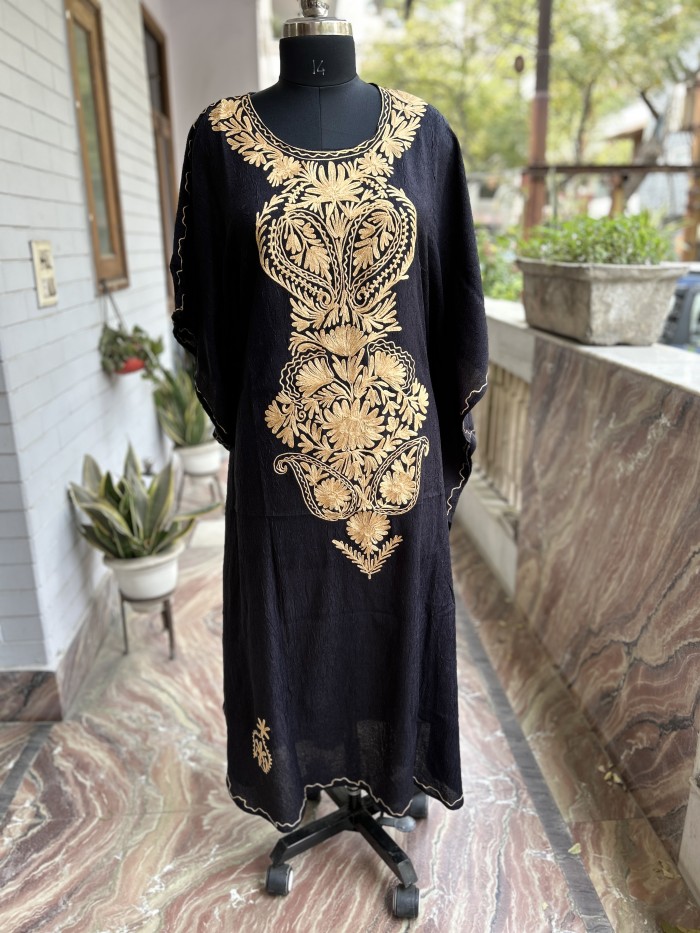 Black Crushed Cotton Kaftan with Yellow Floral Embroidery