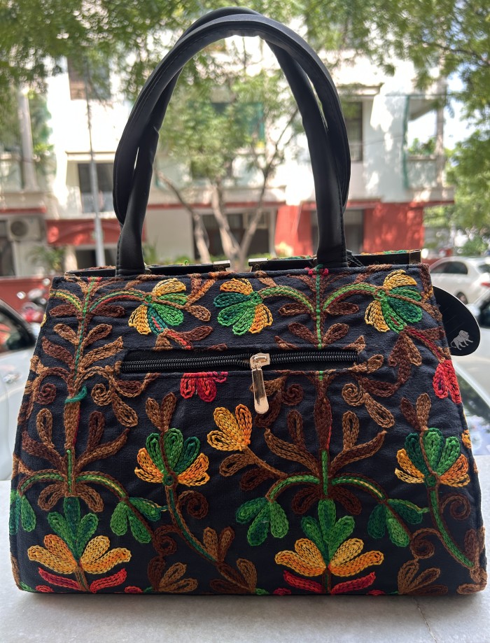 A sophisticated handbag featuring exquisite, colorful embroidery, reminiscent of traditional Kashmiri work, set against a chic black base. This spacious bag is designed for both style and utility, featuring an outer zipper pocket for easy access. The structured shape and polished gold-tone side accents (as seen in IMG_0436.jpg) add a premium finish. The faux leather handles ensure comfortable carrying. Perfect for daily use, office wear, or complementing traditional outfits.