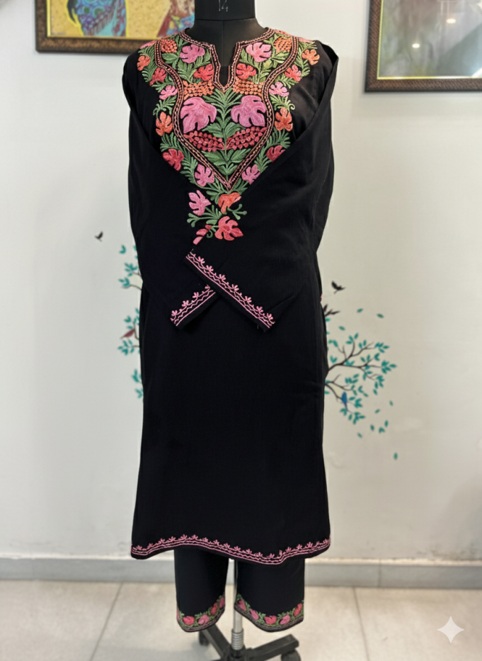 Black Kashmiri Wool Phiran Set with Pink Floral Aari Work