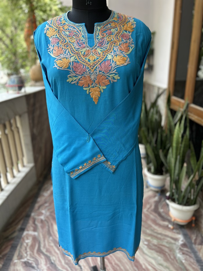 This elegant blue kurti combines rayon comfort with rich pink paisley Aari embroidery, symbolizing Kashmiri craftsmanship. The breathable fabric, minimalist motif placement, and flattering cut make it perfect for everyday wear with a touch of sophistication. Dress it up with jhumkas or keep it subtle — it suits every look.