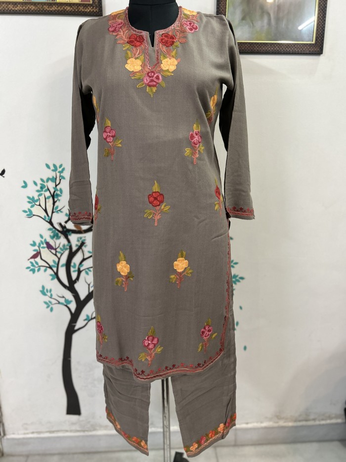 Discover the perfect blend of subtle sophistication and traditional artistry with this Charcoal Grey Wool Blend Cord Set. This 2-piece set features a classic silhouette elevated by delicate, full-length floral embroidery that makes it truly stand out.