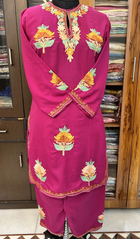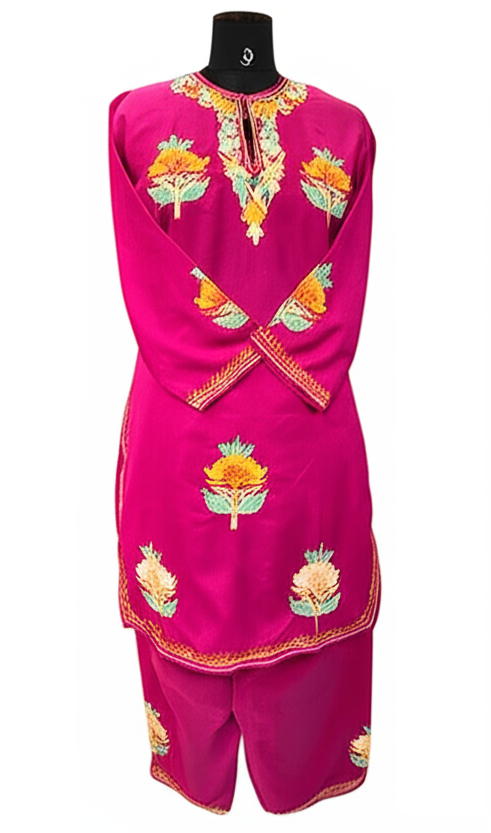 Make a statement with our stunning Kashmiri Aari Embroidered Cotton Co-ord Set in a captivating fuchsia shade. Each piece is a testament to the masterful skill of Kashmiri artisans, featuring vibrant Aari embroidery that intricately weaves floral patterns across the neckline, sleeves, and bottom hem. Crafted from 100% premium breathable cotton, this set offers exceptional comfort and a light, airy feel, making it ideal for any event and all seasons. This eye-catching co-ord set perfectly blends traditional Kashmiri art with modern design, making it an essential addition to your ethnic wardrobe. Whether you're celebrating a special occasion, enjoying a day out, or simply seeking comfortable yet stylish attire, this fuchsia Aari cotton set ensures you exude charm and elegance while showcasing the rich cultural heritage of Kashmir.