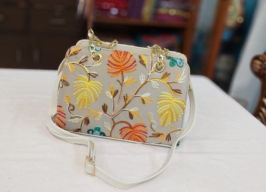 Carry a piece of Kashmir’s artistry with this beautifully embroidered handbag. The bag showcases traditional Aari work, done intricately by skilled artisans, making it both stylish and unique. The compact yet spacious design allows you to carry essentials with ease while adding a touch of heritage to your look.