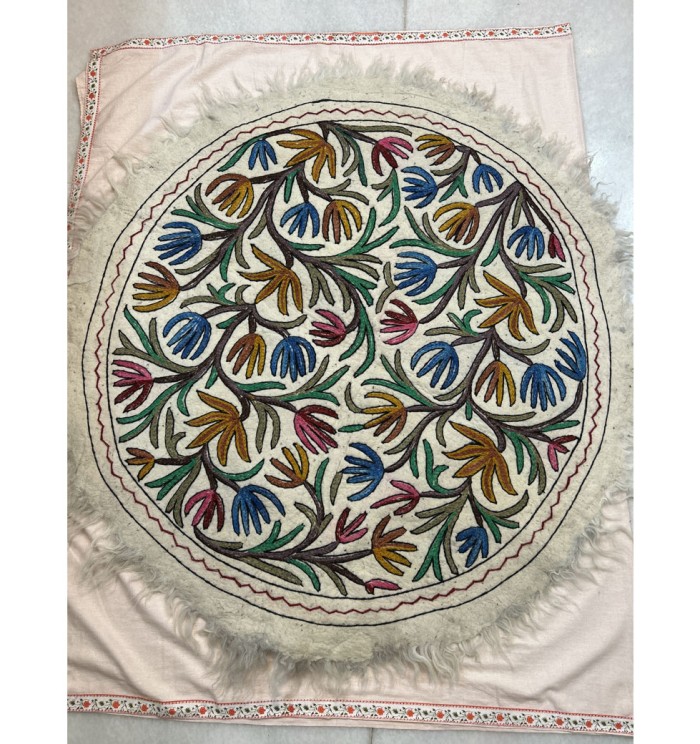 A Kashmiri Namda 4x4 refers to a traditional Kashmiri rug, specifically one made of felted wool (Namda) and embroidered with the Aari technique, measuring approximately 4 feet by 4 feet in size. These rugs are known for their warmth, intricate hand embroidery, and use of natural sheep wool.