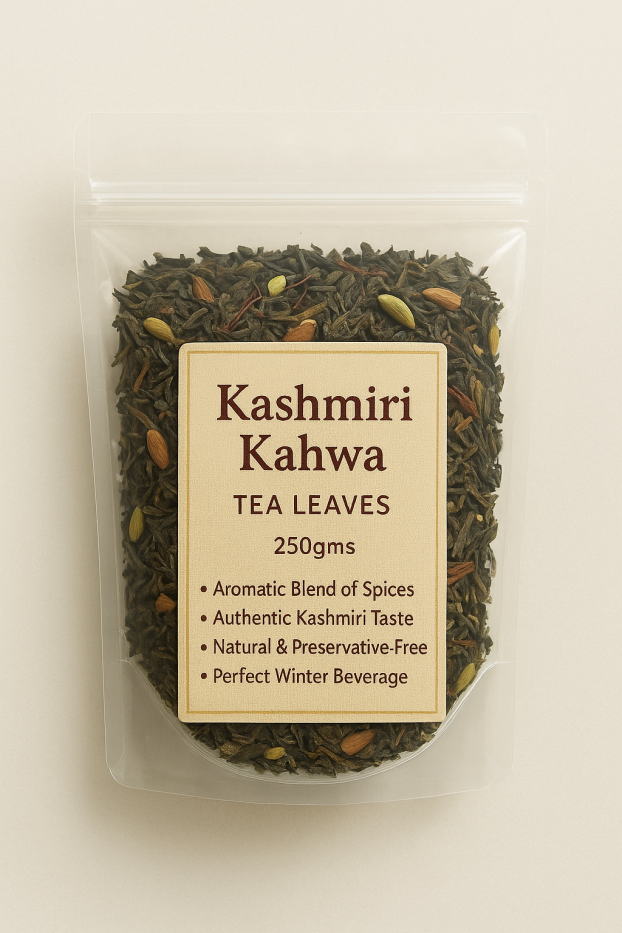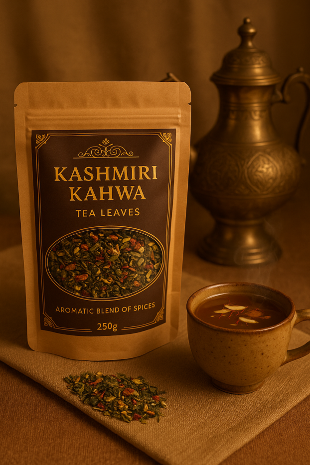 Overview → A premium blend of Kashmiri Kahwa infused with green tea, saffron, cardamom (elaichi), rose petals & almonds for a royal aromatic experience. Benefits → Rich in antioxidants, promotes digestion, relieves stress & strengthens immunity. Taste Profile → Delicate floral notes of rose, warmth of saffron & spice of cardamom, balanced with soothing green tea. Usage → Enjoyed best on chilly mornings/evenings; can be sweetened with honey for a richer taste.