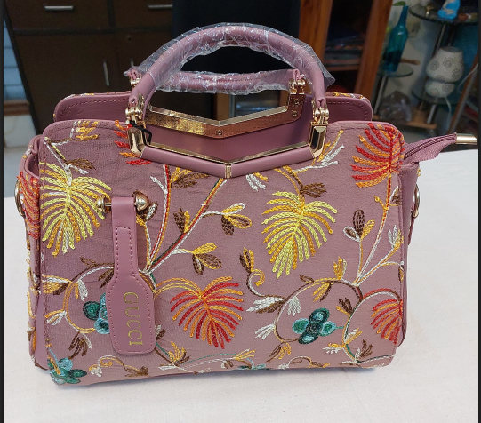 Introducing the Mauve Bloom Embroidered Handbag, a structured carry-all that brings an element of handcrafted charm to your ensemble. The subtle dusty mauve body is the perfect canvas for the striking yellow, red, orange, and teal floral and leaf embroidery. This bag is designed for those who appreciate detailed craftsmanship and a feminine aesthetic.