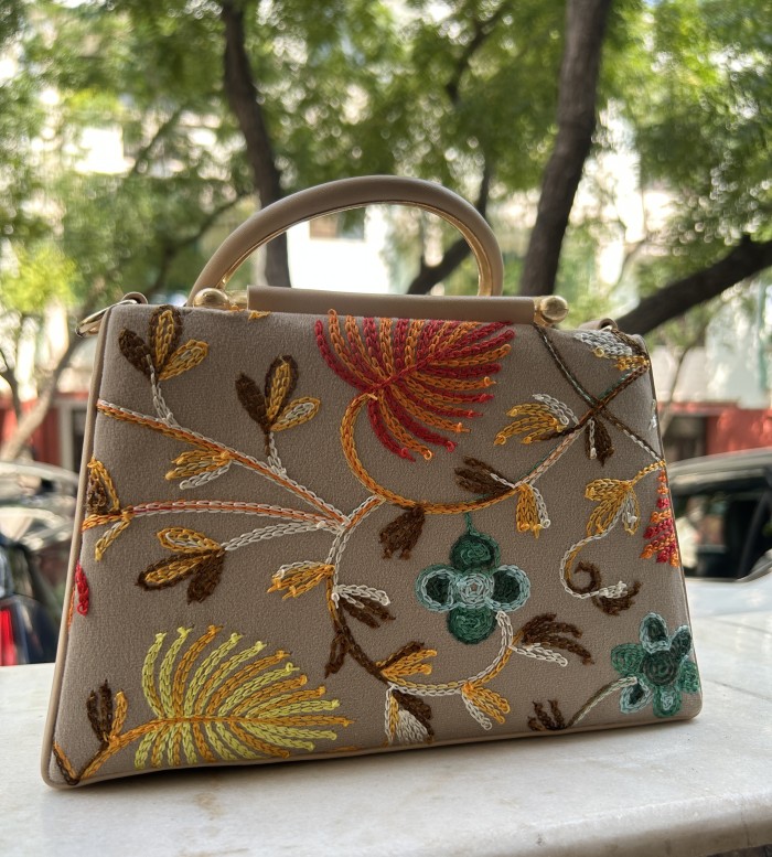 An elegant and compact mini handbag perfect for evenings and special occasions. The structured, box-like silhouette is adorned with beautiful multi-colored floral embroidery set against a sophisticated Taupe/Stone background. Its small size is ideal for carrying essentials like a phone, keys, and lipstick. The rigid design, subtle gold-tone hardware, and classic top handle give it a refined, high-end feel. A beautiful accessory to complete your festive or party look.