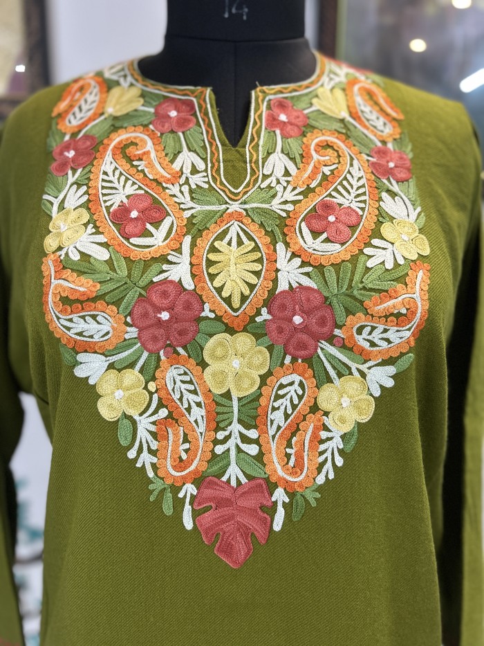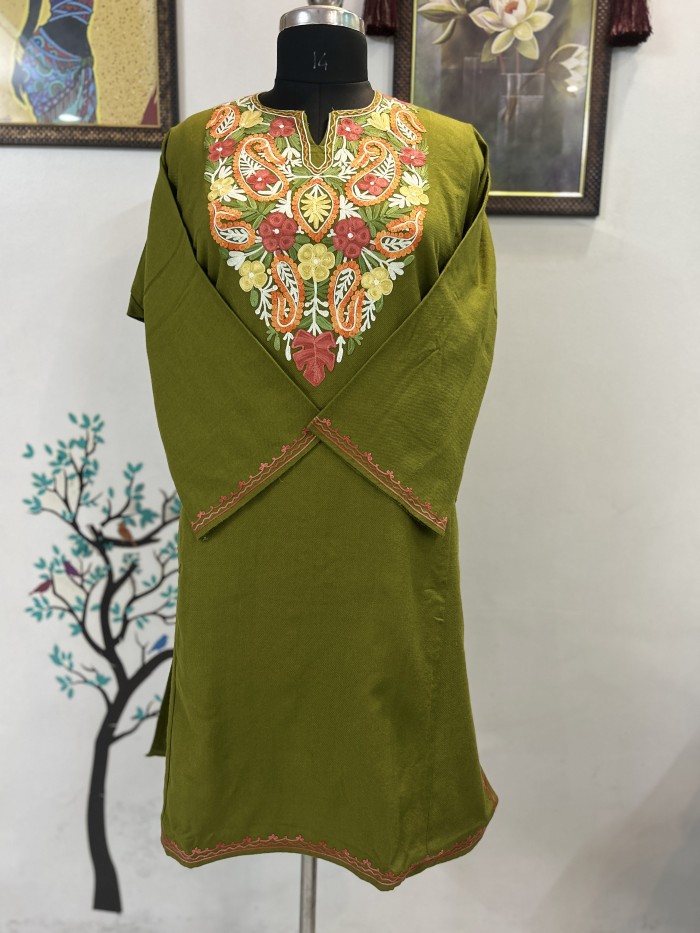 Elevate your winter wardrobe with this beautifully crafted Phiran, combining a comfortable warm fabric with the exquisite traditional artistry of Kashmiri needlework in a vibrant, sophisticated hue.