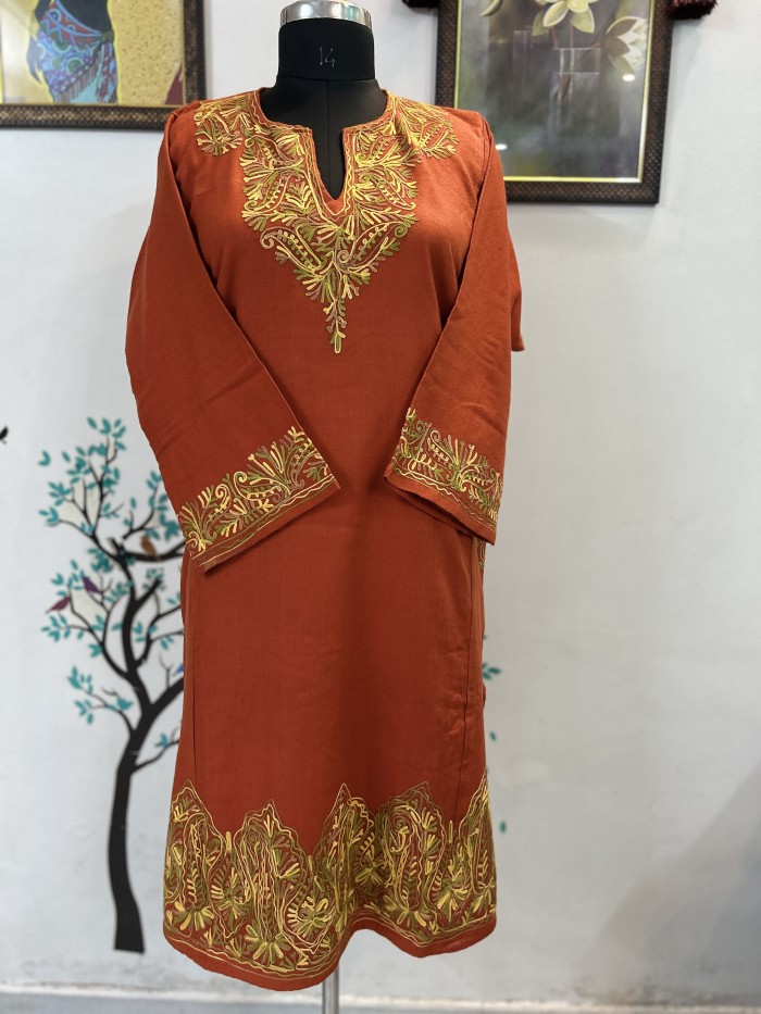 Rust Orange Wool Phiran with All-Over Golden Aari Work