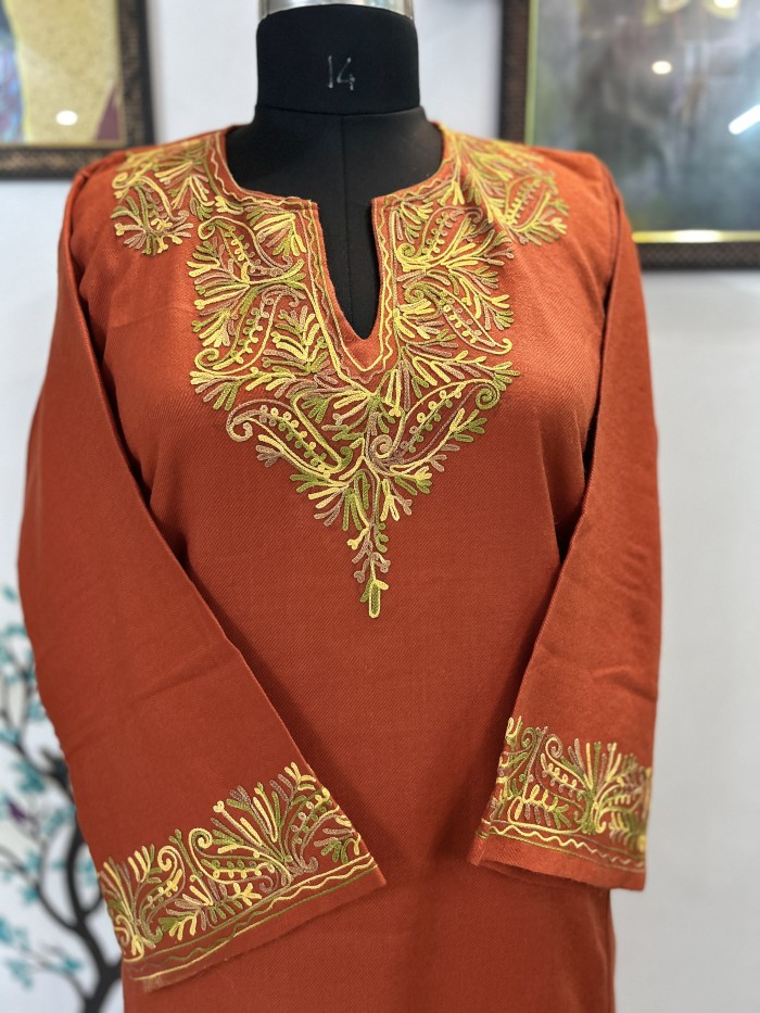 Elevate your winter wardrobe with this beautifully crafted Phiran, combining a comfortable warm fabric with the exquisite traditional artistry of Kashmiri needlework in a vibrant, sophisticated hue.