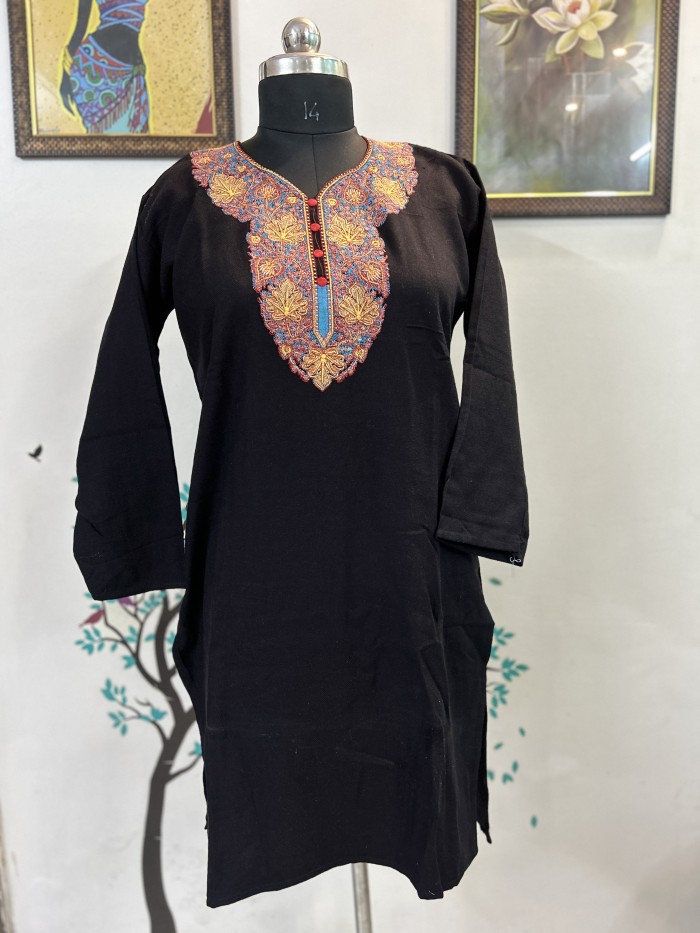| Craftsmanship & Comfort : | 1. Genuine Aari Work: Intricate and vibrant thread embroidery (Aari work) adorns the neckline, showcasing rich Indian textile tradition. 2. Soft Wool Blend: Crafted from a comfortable, warm wool/pashmina blend fabric, perfect for winter and cold weather. 3. Classic Straight Fit: Features a straight cut with side slits for a flattering fit and ease of movement. 4. Versatile Style: Can be paired with leggings, pajamas, or jeans for an elegant casual or semi-formal look. |
