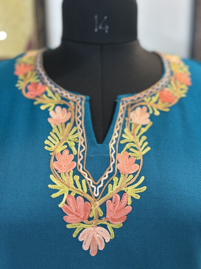 Teal Green Wool Blend Winter Cord Set with Kashmiri Aari Embroidery