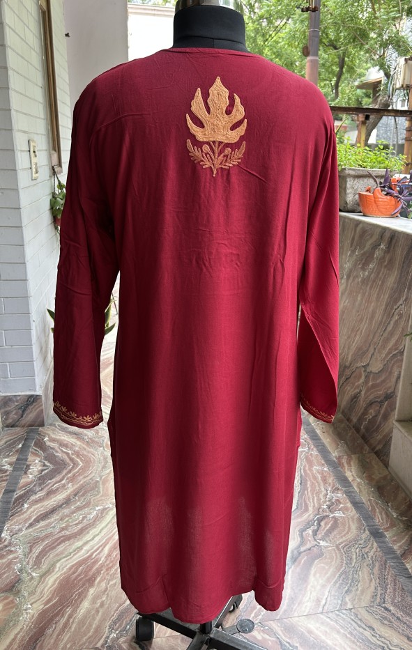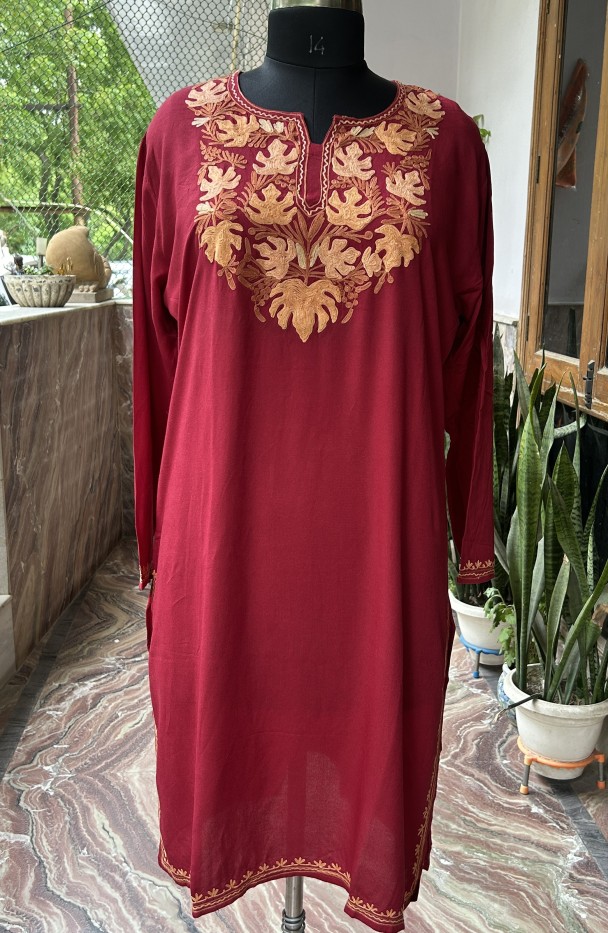 Our "Golden Chinar" Kashmiri Aari Embroidered Kurti is a perfect blend of tradition and modern style. This piece showcases a striking design with hand-stitched Chinar leaf motifs, a classic symbol of Kashmir, beautifully crafted on the neckline. The golden embroidery pops against the rich red fabric, making it a standout piece.
