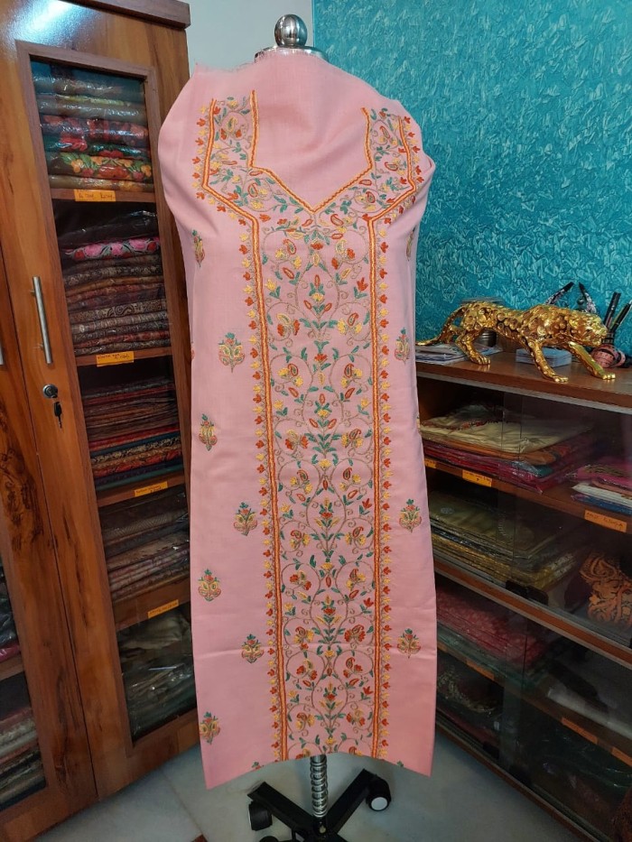 Introduce a touch of charming elegance to your collection with our Unstitched Handwork Kashmiri Aari Suit in a beautiful blush pink. This exquisite suit material is a celebration of intricate artistry, featuring vibrant multi-color Aari embroidery that adorns the fabric in delicate floral and winding vine patterns. Each stitch contributes to a rich tapestry of hues, creating a visually captivating and unique design. Made from a comfortable and refined fabric, this unstitched suit offers a gentle feel against the skin while providing the perfect foundation for your personalized style. Its adaptable nature allows you to tailor it to your exact measurements and design preferences, ensuring a flawless and flattering fit. Elevate your wardrobe with this charming piece that blends comfort, customization, and the unparalleled beauty of Kashmiri hand embroidery, making it an ideal choice for any occasion.
