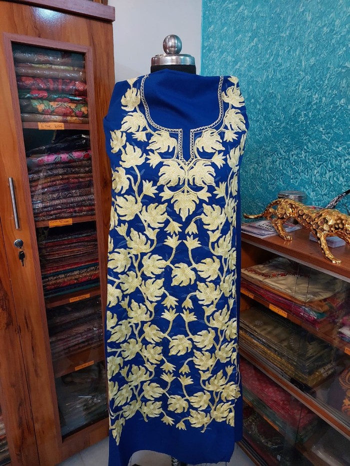 Step into regal elegance with our Unstitched Kashmiri Aari Work Summer Suit in a captivating royal blue. This exquisite suit material is designed for those who appreciate luxurious style and the meticulous artistry of Kashmir. The highlight is the magnificent golden Aari embroidery, intricately hand-stitched in dense floral and leaf patterns that adorn the entire front, creating a dazzling and sophisticated visual appeal. Crafted from a lightweight and airy fabric, this unstitched suit is an ideal choice for the summer months, offering both comfort and unparalleled style. Its adaptable nature empowers you to customize it to your precise measurements and design preferences, whether you envision a classic kurti, a contemporary tunic, or a complete suit set. Elevate your ethnic wardrobe with this unique piece that blends comfort, personalization, and the unparalleled beauty of Kashmiri hand embroidery.