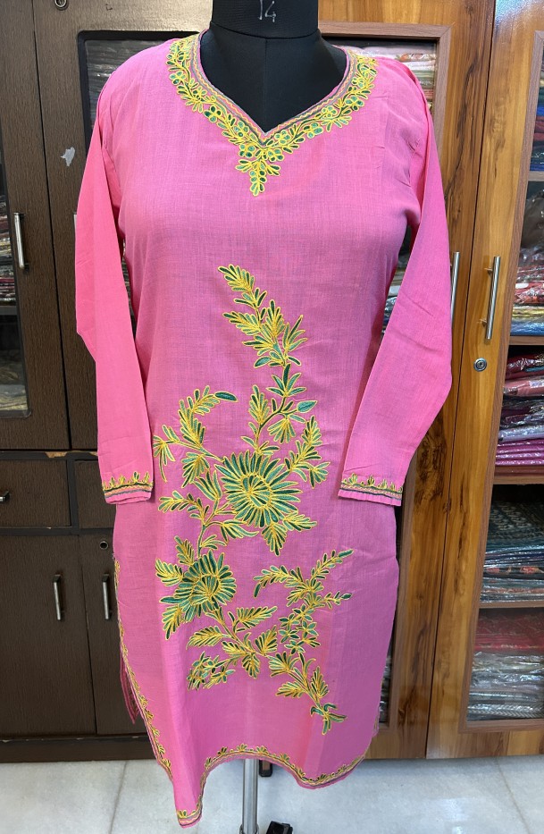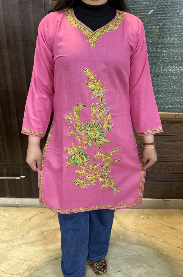 Infuse your wardrobe with a pop of color and traditional artistry with our Vibrant Pink Kashmiri Aari Embroidered Cotton Kurti. Crafted from 100% pure, breathable cotton, this kurti offers supreme comfort for everyday wear. The striking bright pink hue serves as a beautiful backdrop for the exquisite Kashmiri Aari embroidery, featuring bold floral and leafy patterns in contrasting shades of green and yellow. The intricate handwork adorns the neckline and cascades down the front, showcasing the meticulous craftsmanship that Kashmir is renowned for. This versatile kurti is perfect for brightening up your casual outings, adding a touch of elegance to festive gatherings, or bringing a unique flair to your daily style. Pair it with white, cream, or even contrasting colored bottoms to complete your effortlessly chic look.