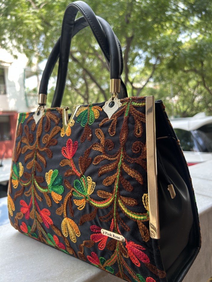 A sophisticated handbag featuring exquisite, colorful embroidery, reminiscent of traditional Kashmiri work, set against a chic black base. This spacious bag is designed for both style and utility, featuring an outer zipper pocket for easy access. The structured shape and polished gold-tone side accents (as seen in IMG_0436.jpg) add a premium finish. The faux leather handles ensure comfortable carrying. Perfect for daily use, office wear, or complementing traditional outfits.