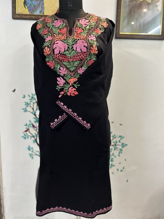 Black Kashmiri Wool Phiran Set with Pink Floral Aari Work