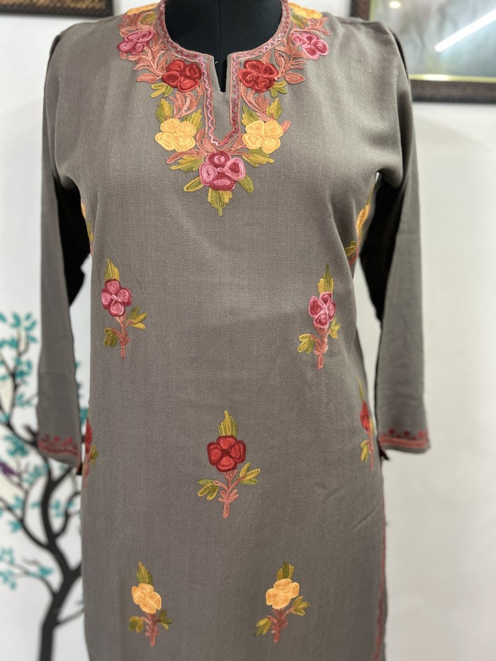 | Design & Warmth : | Sophisticated All-Over Design: Features beautifully scattered floral motifs across the entire length of the tunic, complemented by a dense embroidered yoke. |