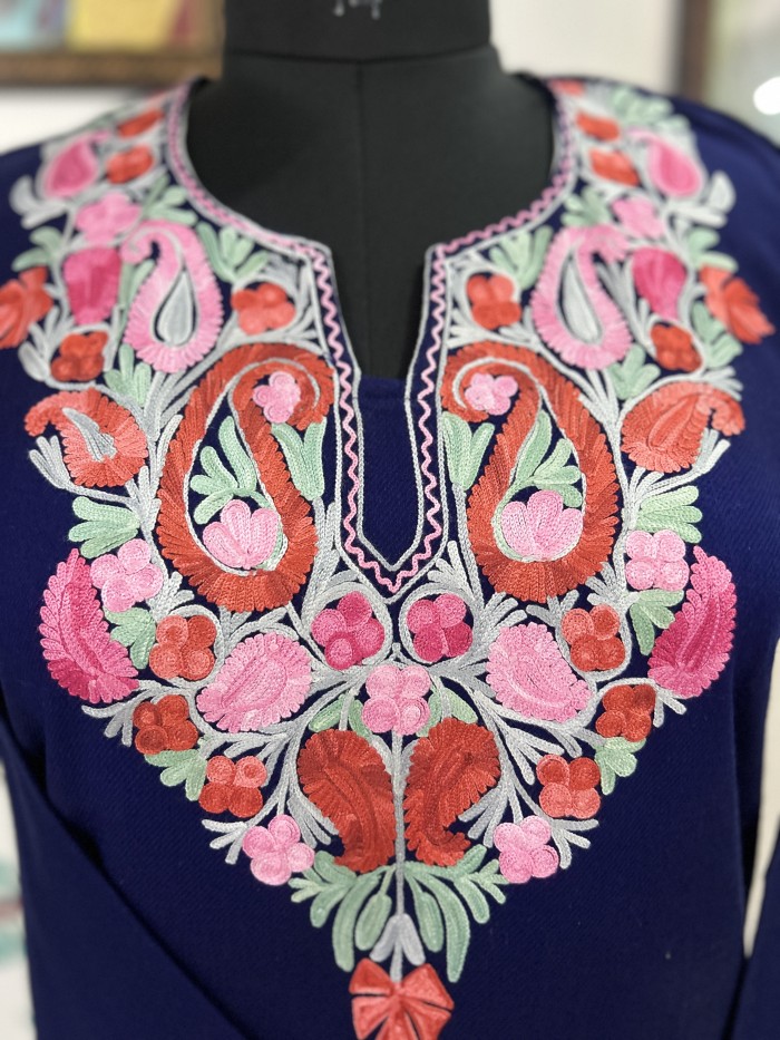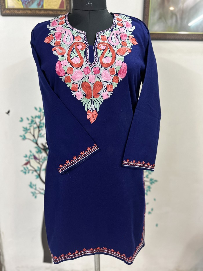 Deep Blue Woolen Kurti with Pink Floral Aari Work
