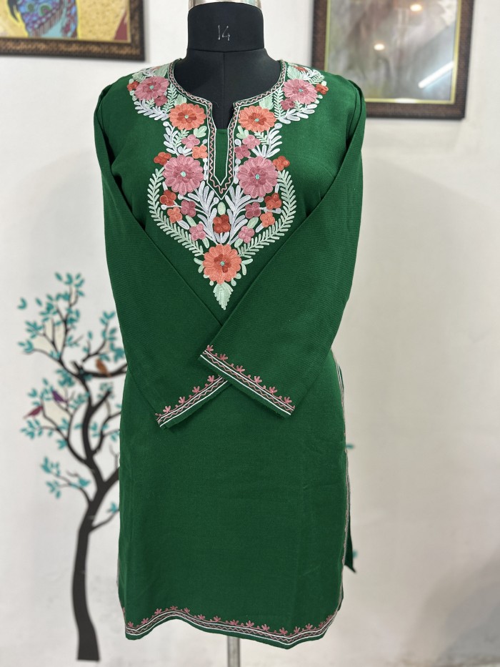 Forest Green Woolen Kurti with Multi-Colour Floral Aari Work