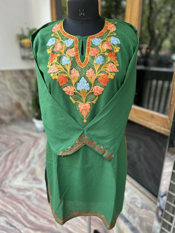 Add a splash of Kashmiri elegance to your wardrobe with this charming pistachio green cotton kurti, featuring exquisite hand Aari embroidery in warm orange and mustard threads. The classic paisley motifs on the yoke paired with floral detailing on the hem and cuffs reflect the richness of Kashmiri artistry. Made from breathable cotton fabric, it is perfect for everyday wear or semi-formal occasions, offering both comfort and traditional style. A timeless piece for those who appreciate understated sophistication.