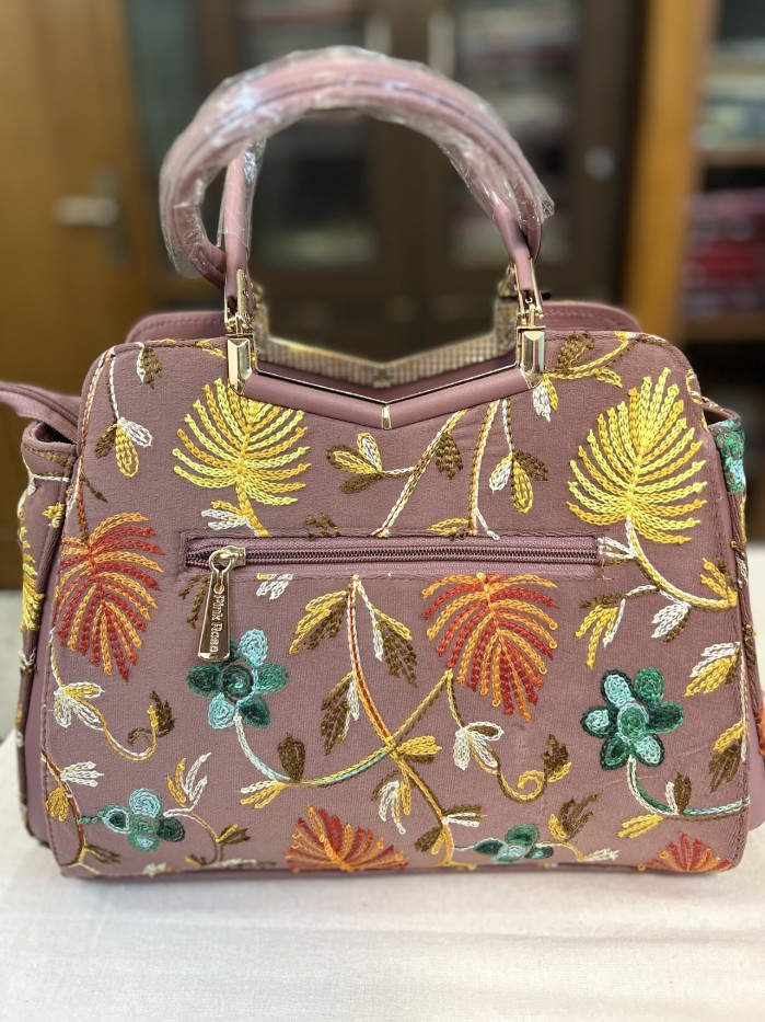 Introducing the Mauve Bloom Embroidered Handbag, a structured carry-all that brings an element of handcrafted charm to your ensemble. The subtle dusty mauve body is the perfect canvas for the striking yellow, red, orange, and teal floral and leaf embroidery. This bag is designed for those who appreciate detailed craftsmanship and a feminine aesthetic.