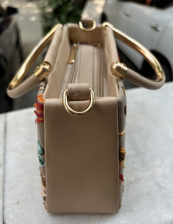 An elegant and compact mini handbag perfect for evenings and special occasions. The structured, box-like silhouette is adorned with beautiful multi-colored floral embroidery set against a sophisticated Taupe/Stone background. Its small size is ideal for carrying essentials like a phone, keys, and lipstick. The rigid design, subtle gold-tone hardware, and classic top handle give it a refined, high-end feel. A beautiful accessory to complete your festive or party look.