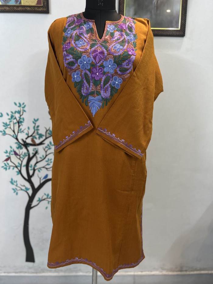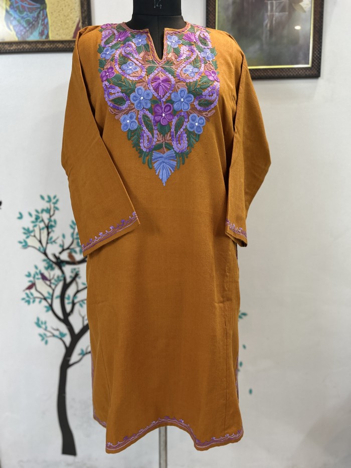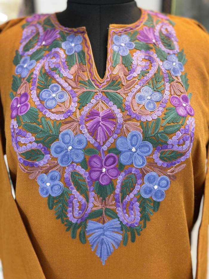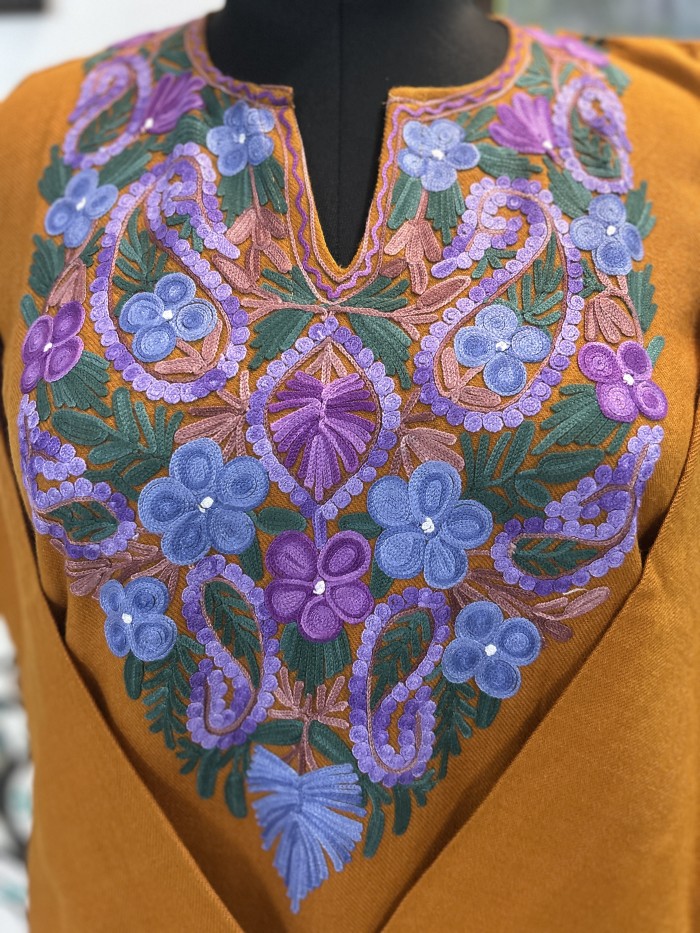 Mustard Wool Phiran with Purple & Blue Aari Work