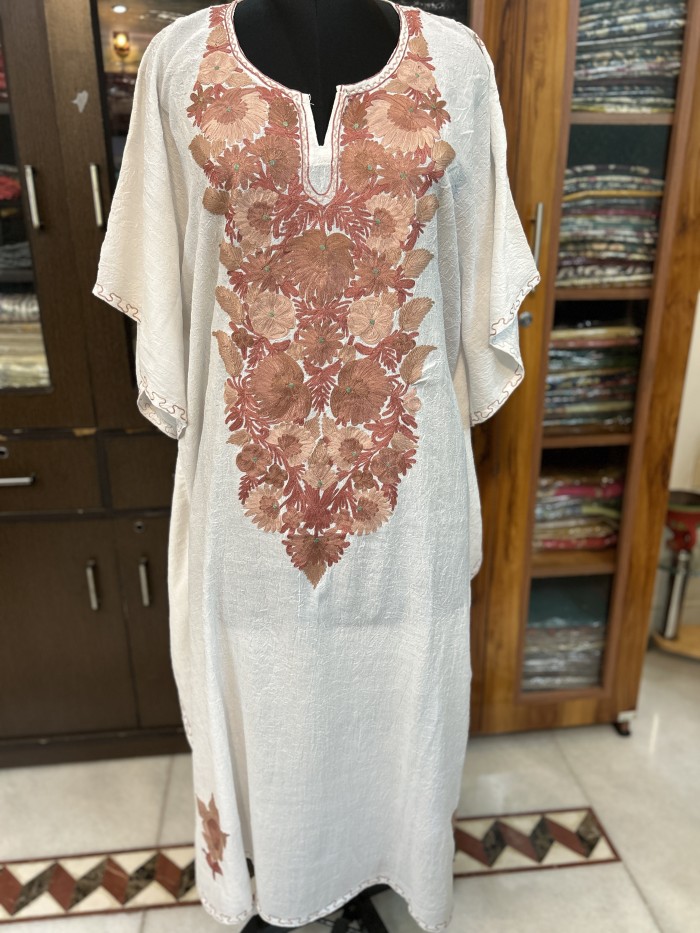 Radiate warmth and elegance with this off-white kaftan featuring intricate floral embroidery in rust and peachy brown tones. The U-slit neckline and relaxed silhouette make it a timeless choice for those who love subtle ethnic charm with breathable comfort. Crafted in crushed cotton, this piece is ideal for casual wear, brunches, or lounging.
