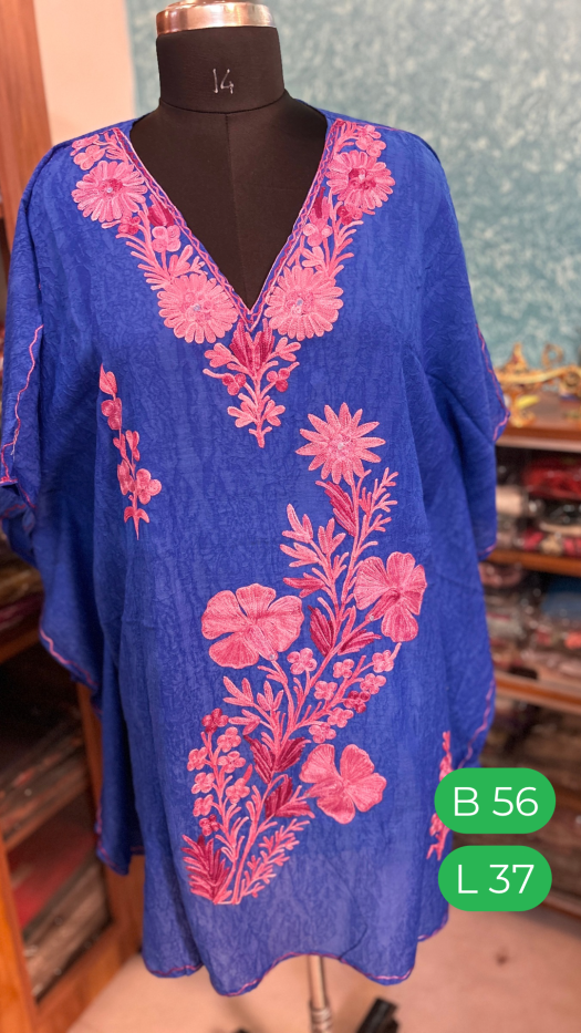 Royal Blue Kaftan with Pink Floral Embroidery | Cotton Summer Wear