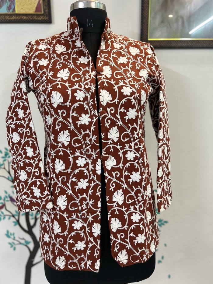 This stunning Rust Red woolen jacket elevates your style with its full white floral Aari embroidery, making it a perfect stand-out piece for winter layering.