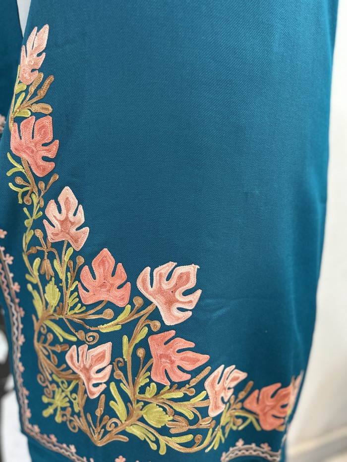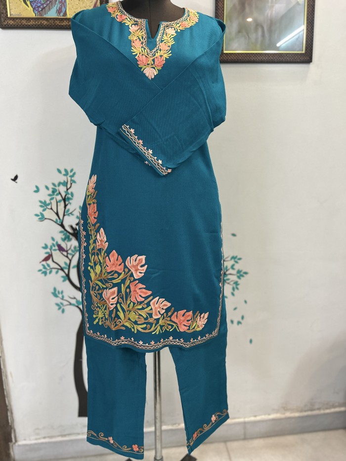Teal Green Wool Blend Winter Cord Set with Kashmiri Aari Embroidery