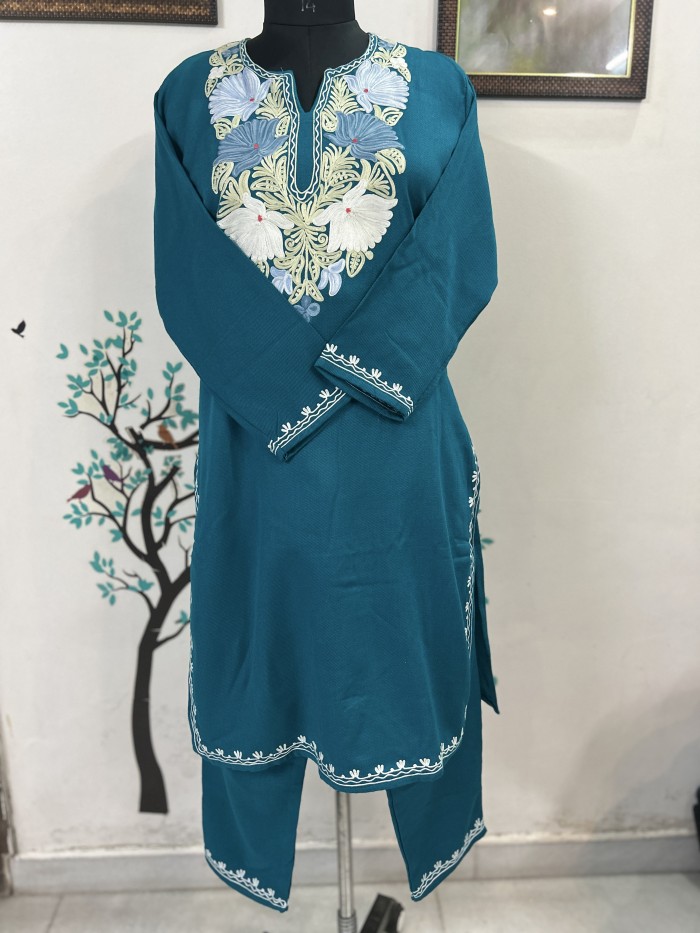 Teal Wool Blend Cord Set with Elegant White & Blue Aari Work