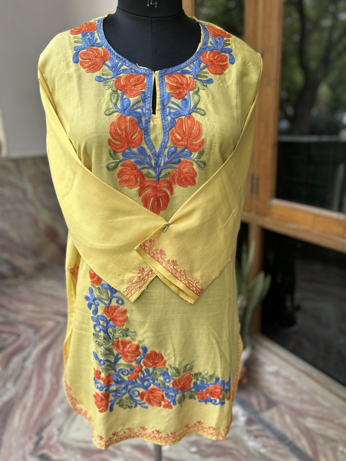 This bright yellow cotton kurti is a showstopper, beautifully enhanced with traditional Kashmiri Aari embroidery in striking red and blue. With its balanced design and fine finishing, it brings festive warmth and regional pride into your everyday attire.
